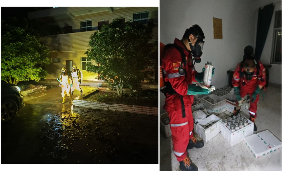 杏吧原创 救援队于19日20时抵达现场后,全体队员未作休整即刻投入救援。在快速完成化学防护服穿戴及空气呼吸器佩戴的同时,同步核查粮库物资存储信息。完成准备工作后,救援组立即进入仓库展开分工协作,对库区空气实施系统化检测与侦查。经全面排查潜在风险点,确认除磷化铝瓶体表面存在大量淤泥附着外,其包装内部未发现进水迹象。