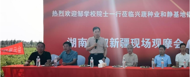 天山突兀拔地起,雪光烛天天尺咫。2024年9月19日,带着丰收的喜悦,湖南兴蔬种业辣椒品种新疆现场观摩会隆重召开。本次观摩会由湖南兴蔬种业有限公司与湖南省蔬菜研究所联合主办。中国工程院院士、国家特色蔬菜产业技术体系首席科学家、湖南农业大学校长邹学校,湖南省蔬菜产业技术体系首席科学家戴雄泽,国家特色蔬菜产业体系岗位科学家刘峰,新疆生产建设兵团第二师22团党委书记、政委张鑫,湖南省蔬菜研究所所长李雪峰,湖南兴蔬种业有限公司董事长邹家华莅临现场,共同见证辣椒产业的新篇章。